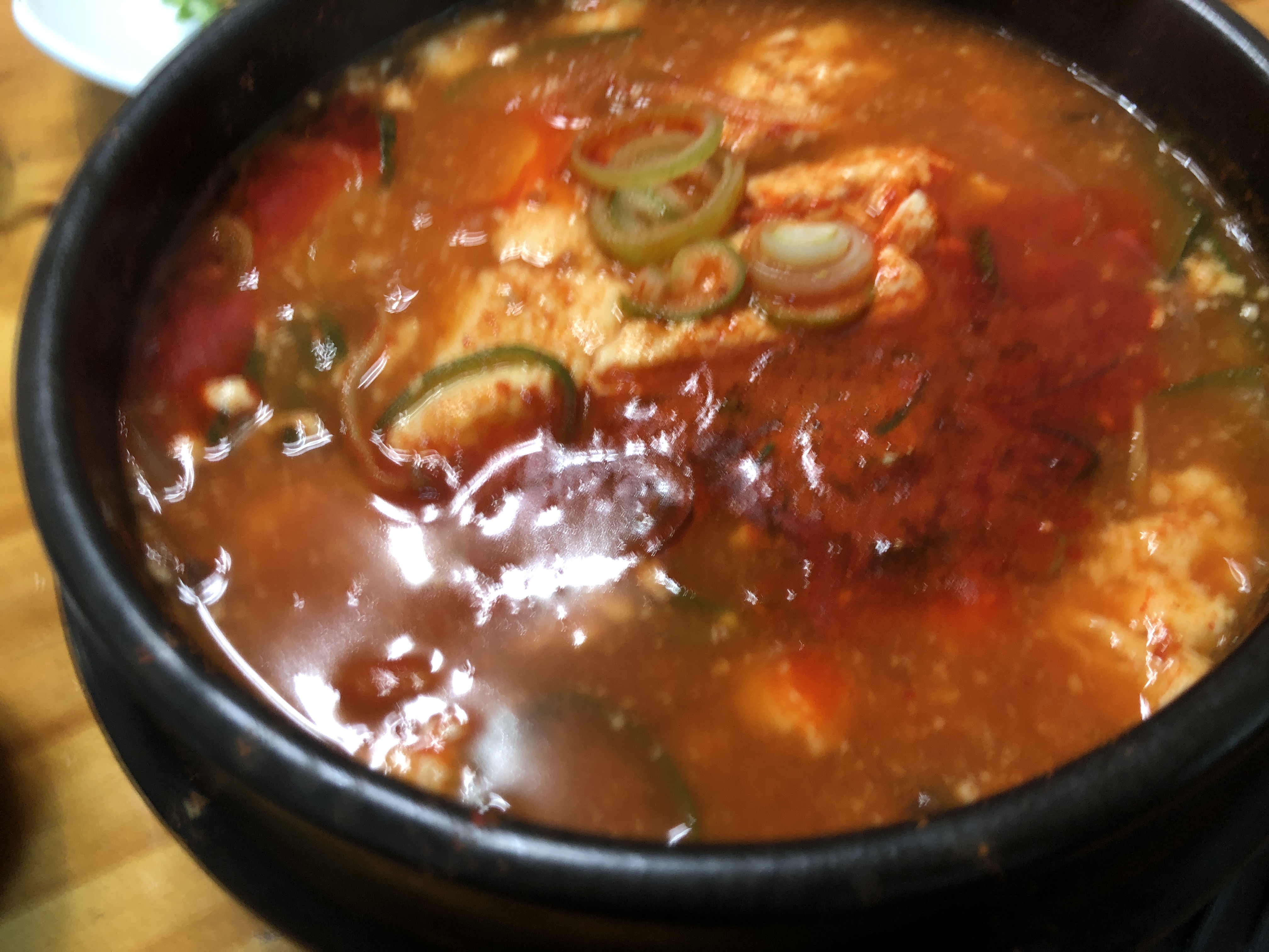 주문한 매뉴는 얼큰순두부입니다. 빠알간 국물에 순두부가 맛있는 요리입니다.
