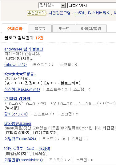 네이버 블로그 메인 페이지(blog.naver.com)에서 검색을 해 본 적이 있는가? 아래 그림과 같이 '티컵강아지'로 검색을 하면 포스트의 제목 뿐만 아니라 "블로그의 제목", "아이디/별명", "포스트 내용", "카테고리 제목"까지 모두 검색을 해서 결과를 출력한다.