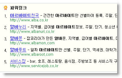 우리는 여기서 특정 키워드의 활성화 정도를 알아 볼 수 있다. 예컨데, "아르바이트"라는 키워드는 전월에 1,699,174회의 쿼리를 기록했다고 나온다. <그림 1>에서 보듯 이 키워드의 <파워링크> 광고는 이미 5개가 모두 판매되었다. 가격은 320만원에서 550만원까지다.