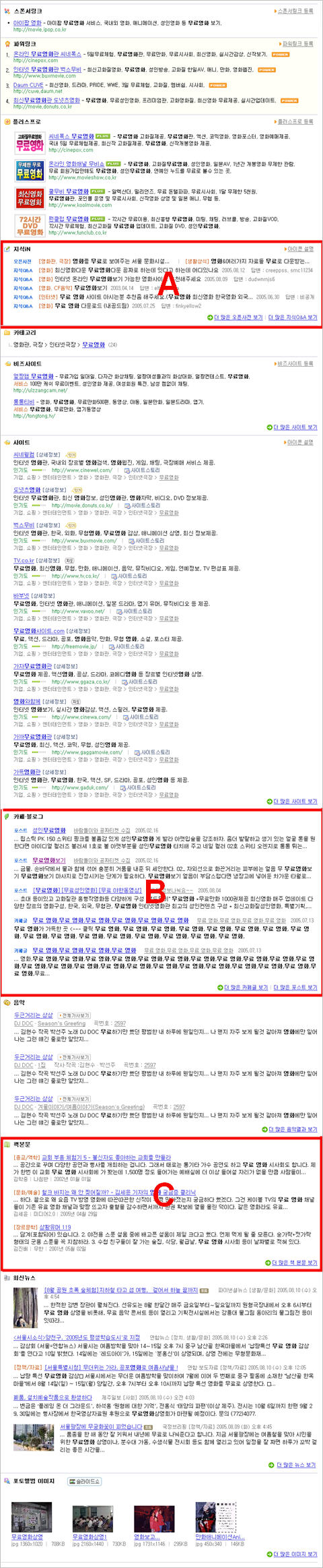 B섹션은 카페와 블로그에 대한 검색 결과를 보여준다. 예제 그림에서 보다시피 이미 광고꾼들이 카페와 블로그를 통해 검색에 노출되기 위해 작업성 포스트와 카페를 많이 생성해 두었다. 이런 카페와 블로그는 네이버 측에 의해 폐쇄될 수 있음을 잊지 말아야 한다.