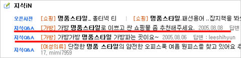 A섹션은 보다시피 지식in 관련 섹션이다. 이 섹션을 이용한 홍보전략은 꽁수가 상당히 존재한다. 그 중 하나는 아래와 같은 예제다. 네이버 검색에서 "명품스타일"이라는 키워드로 조사를 해보면 지식in에 다음과 같은 결과가 나온다. 밑줄 친 두 개의 지식 Q&A는 실제로 한 사람이 서로 다른 아이디로 질문과 답변을 한 것이다. 한 마디로 검색에 노출되기를 바라며 이런 짓을 한 것이다.